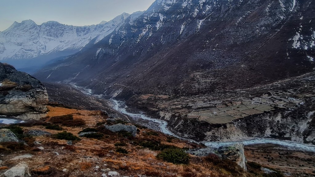 Starting from the village at 4,200 metres meant 1,500 metres of elevation gain—assuming I reached the top at all. The summit was rocky, and though a snow gully led upward, I couldn’t tell whether it continued all the way. I wasn’t even certain I could reach the mountain itself; between us lay a wide, roaring glacial river. What I could do was try.